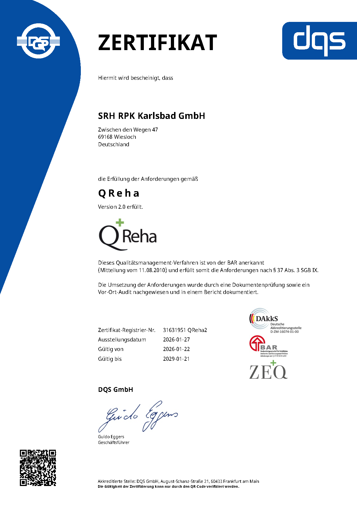 Seit April 2012 ist die SRH RPK Karlsbad GmbH umfassend zertifiziert.